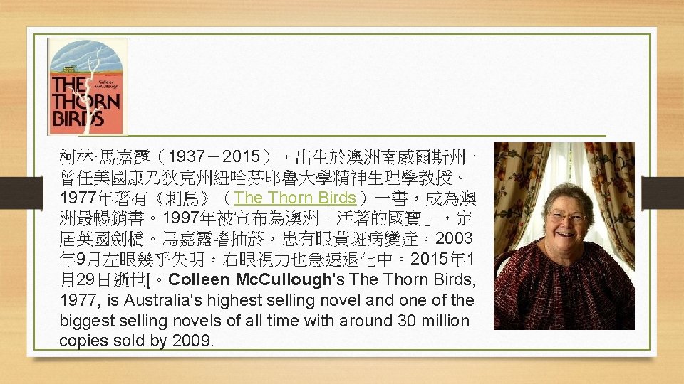 派屈克·懷特(Patrick White,1912-1990),澳大利亞小說家、劇作家, 他被認為是 20世紀最重要的英文作家之一。從 1935年開始,他出版了12部 小說、4部短故事集、8部劇本和非小說類文學作品。他的小說可以在情節 性描寫和意識流間自由切換。1973年他獲得諾貝爾文學獎。Patrick White (1912 – 1990) was an Australian writer who is widely regarded as one of the most important English-language novelists of the 20 th century. From 1935 to his death, he published 12 novels, three short-story collections and eight plays. White's fiction employs humour, florid prose, shifting narrative vantage points and a stream of consciousness technique. In 1973, he was awarded the Nobel Prize in Literature, the first Australian to have been awarded the prize.