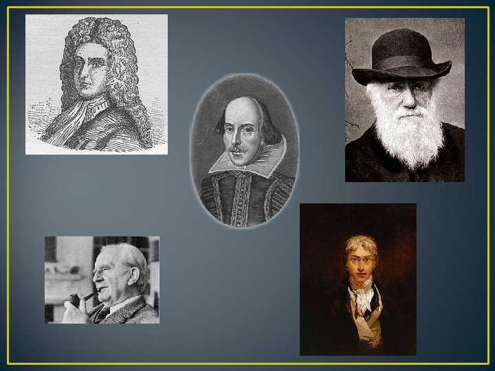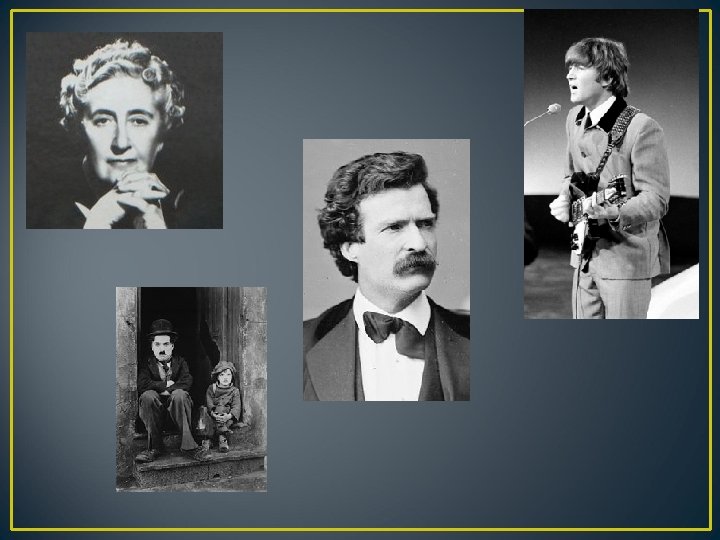 Say what these people are famous for A. Christie the wonderful colours in his pictures D. Defoe his novel « Robinson Crusoe» C. Chaplin his films J. Turner her detective stories W. Shakespeare is famous for his books «The Hobbit» , «the Lord of Ring» J. Lennon his theory of evolution M. Twain his songs J. Tolkien his poems and plays C. Darwin his books