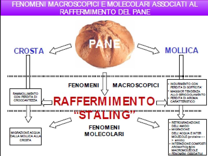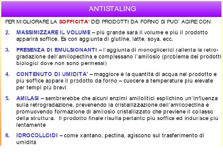 La cottura stabilizza la struttura “lievitata” del glutine: • durante la fase di cottura, l’amido gelifica e le proteine si denaturano al calore • l’umidità residua dipende dalla pezzatura; le trasformazioni a carico dell’amido porteranno ad una retrogradazione più o meno veloce (pane più o meno resistente al fenomeno dello “stantio” o “staling”) • Le temperature variano da 200 -275 °C (dipende da: tipo di forno, durata, pezzatura pane) alveolatura del pane
