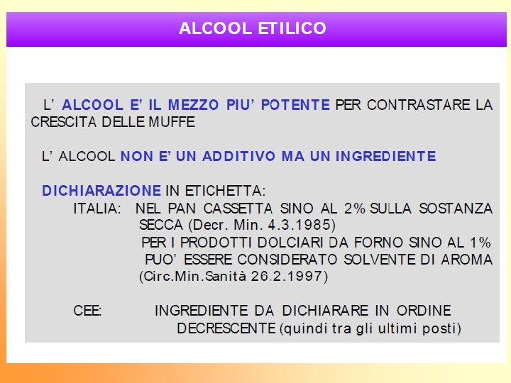 LA LIEVITAZIONE Naturale (PANE) Saccharomyces cerevisiae C 6 H 12 O 6 2 C 2 H 5 OH + 2 CO 2 C 6 H 12 O 6 + 6 O 2 6 CO 2 + 6 H 2 O Anaerobiosi Aerobiosi Lievitazione chimica Liberano gas (CO 2) aumentando il volume di un impasto (nel caso di pane e dolci) o di una pastella (nel caso di alimenti fritti) Acido citrico; tartrato monopotassico; pirofosfato disodico; sodio e ammonio bicarbonato (E 501 ed E 503). I lieviti in commercio sono miscele di agente lievitante + agente acidificante + sostanza inerte (es. amido)
