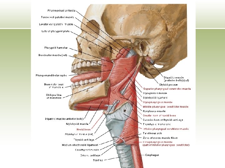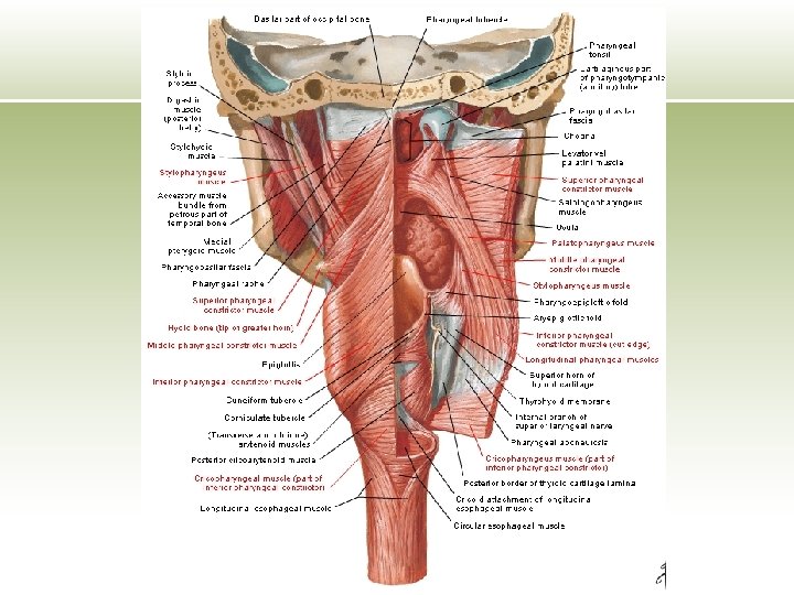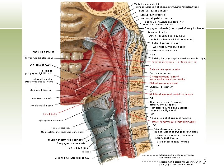 RAPORTURILE FARINGELUI BAZA se inseră pe baza craniului, pe porţiunea bazilară a occipitalului şi pe faţa inferioară a stâncilor temporalelor. • 3 -fascia faringobazilara; 4 rafeul fibros; 5 m. Stilofaringian; 6 m. Constrictor superior; 7 bursa posterioara a m. Digastric; 8 m. Stilohioid; 9 m. Constrictor mijlociu; 10 m. Constrictor inf; 11 triunghiul Killian; 14 Tiroida/Paratiroida; 22 triunghiul Lamier