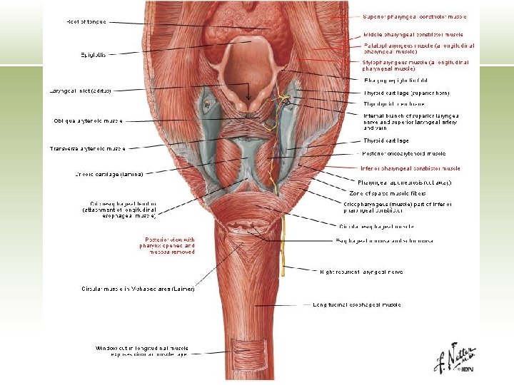 NERVII • • • 1. m. stilofaringian 2. n. glosofaringian 3. m. stiloglos 4. vagul superior 5. ramura laringeala superioara a vagului 6. laringeu intern 7. laringeu extern 8. constrictor faringeal inferior 9. constrictor faringeal mijlociu 10. esofag