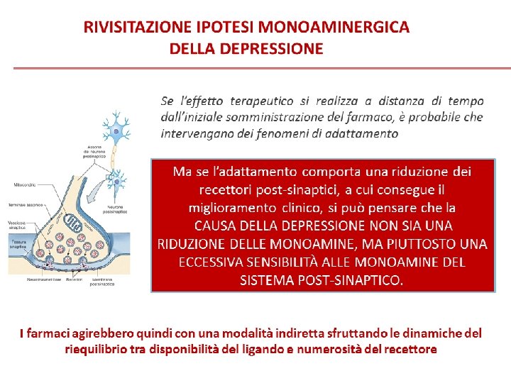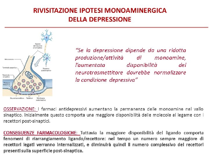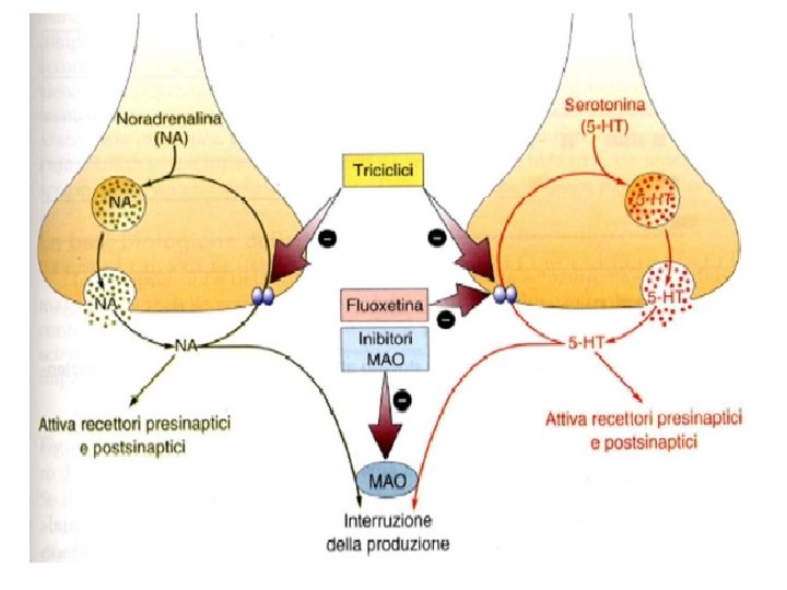 Farmaci Antidepressivi (AD) Ø Il meccanismo farmacodinamico generale degli antidepressivi è quello di aumentare la disponibilità a livello sinaptico delle amine neurotrasmettitrici (serotonina, noradrenalina e, in misura minore, dopamina) Ø Tale meccanismo è immediatamente efficace nel controllo del dolore e attiva una cascata di meccanismi (post-sinaptici, epigenetici etc) che solo dopo alcune settimane determinano una adeguata risposta antidepressiva e/o ansiolitica