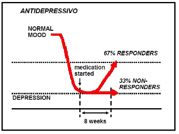 Farmaci e depressione v La terapia farmacologica è l’approccio di prima scelta (ma non deve essere l’unico) nella depressione v Esistono diversi farmaci antidepressivi efficaci ma la terapia farmacologica ha diversi limiti: ü Latenza nella risposta; ü Un terzo dei pazienti trattati risponde in maniera insufficiente; ü Solo 30 -40% pazienti ha una remissione completa dei sintomi; ü Reazioni avverse sia a breve che lungo termine; ü Molte interazioni farmacologiche