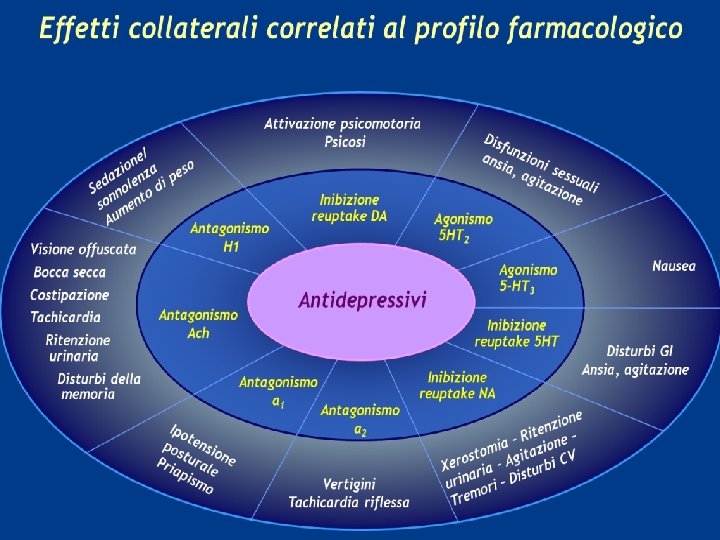 Antidepressivi triciclici (TCA) ü Devono il loro nome alla presenza nella struttura chimica di tre anelli. Inibiscono non selettivamente la ricaptazione di serotonina (più attive le amine terziarie) e noradrenalina (più attive le amine secondarie). Bloccano anche i recettori H 1 dell’istamina, i recettori colinergici e i recettori α-1 adrenergici. Sono inoltre stabilizzatori delle membrane (azione chinidino-simile) ü Largamente impiegati in passato sono oggi considerati di seconda scelta, soprattutto negli anziani e nei pazienti con polipatologie, a causa dei loro molteplici effetti avversi derivanti dalle molteplici azioni farmacologiche