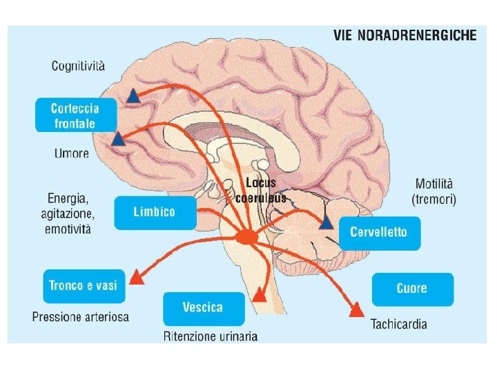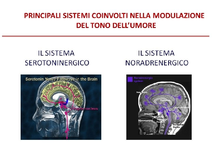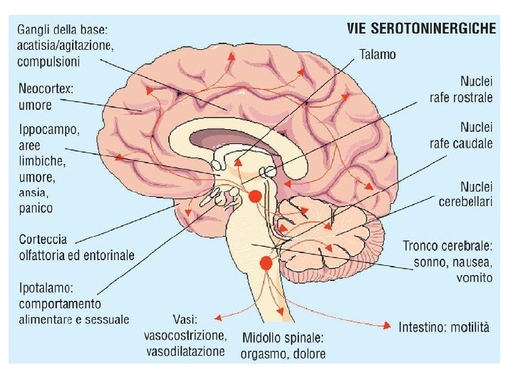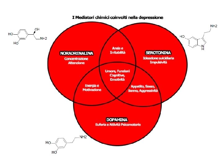 Biologia della depressione § Disregolazione di diversi sistemi di trasmissione del SNC, coinvolgenti in particolari i seguenti neurotrasmettitori: noradrenalina (NA) e serotonina (5 HT) ma anche acetilcolina (ACH), acido gammaamino-butirrico (GABA) e dopamina (DA). § Il sistema serotoninergico centrale ha un ruolo importante nella regolazione del sonno, dell’appetito, delle attività sessuali, del dolore e dei ritmi circadiani, funzioni profondamente alterate nella depressione. § Alterazione delle funzioni ipotalamiche, con disfunzioni neuroendocrine (a carico di ormoni tiroidei, corticosteroidi, prolattina, ormone somatotropo) § Alterazioni del sonno: ridotta latenza REM, aumentata densità REM, anomala distribuzione circadiana del sonno REM, riduzione del sonno ad onde lente