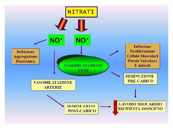 NITRODERIVATI • Effetto – Vasodilatatori /venodilatatori/dilatazione coronarica • Indicazione terapeutica – Antianginosi – Scompenso /Ipertensione • Effetti indesiderati – Cefalea – Ipotensione – vasodilatazione