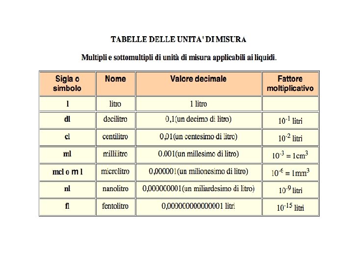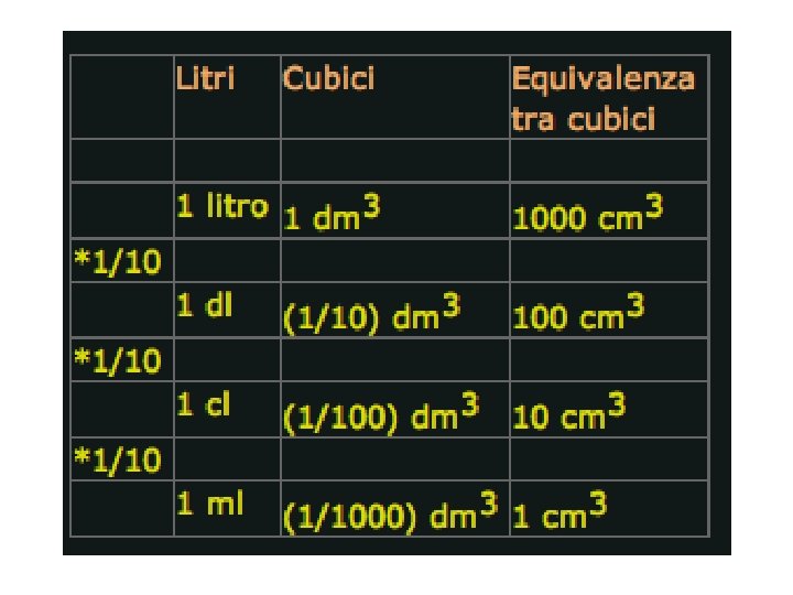 1 METRO CUBO = 100 DECIMETRI CUBI 1 DECIMETRO CUBO = 100 CENTIMETRI CUBI 1 CENTIMETRO CUBO = 100 MILLIMETRI CUBI 1 LITRO = 1 DECIMETRO CUBO = 1000 CENTIMETRI CUBI (la vecchia Fiat 500 ha un motore da 500 cc cioè mezzo litro) 1 MILLILITRO = 1 CENTIMETRO CUBO (una fiala da 10 cc contiene 10 millilitri)