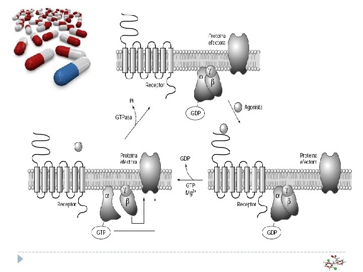 RECEPTORES ACOPLADOS A PROTEINAS G � Implicados en una transmisión relativamente rápida, generándose una respuesta en seg. � Ej: Ø Ø Ø R muscarínicos. R adrenérgicos. R dopaminérgicos. R serotoninérgicos. R de los opioides.
