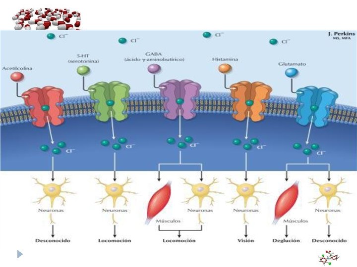 RECEPTORES DE MEMBRANA RECEPTORES ACOPLADOS A CANAL IONICOinotrópicos ü Son complejos macromoleculares de gran tamaño La interacción con el fármaco genera la apertura o cierre del canal Receptores nicotinoides ü Receptores nicotínicos o de acetil colina ü GABA A ü GABA C ü Receptor de glicina ü Receptor 5 HT 3 Receptores de Glutamato / aspartato Receptores purinérgicos P 2 X