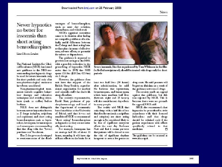 Uso clínico de los hipnóticos En general no se recomienda pautas que superen las 4 -6 semanas* • I. Transitorio: hipnótico con acción media un máximo de 3 días. – Zaleplón para conciliar el sueño, BZD para despertar prematuro, • I. Corta duración: Buena higiene del sueño + hipnótico con acción media durante un máximo de 3 semanas. • I. de larga duración o crónico: evaluación médico-psiquiátrica. – Con patología subyacente: fármacos específicos (antidepresivos, antipsicóticos, antiparkinsonianos, tratamiento enfermedad cardiovascular, neoplásica. . ) + hipnótico con acción corta. – Sin patología: mejorar la higiene del sueño, terapias psicológica + hipnótico con acción media por un período de 3 -4 meses. Remitir a clínica del sueño si no mejora. *la práctica no sigue las recomendaciones (¿administración intermitente? )