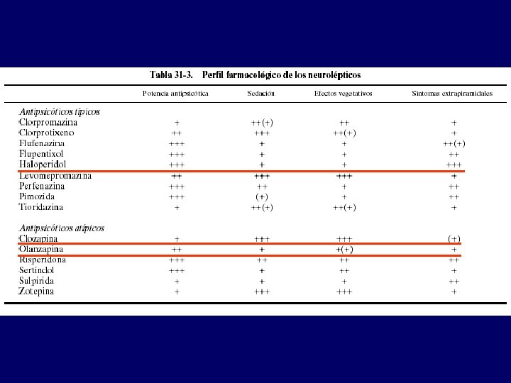 • Típicos (clorpromazina, haloperidol, perfenazina) – Bloquean los receptores D 2 – Eficacia similar en tratamiento síntomas positivos de la esquizofrenia y en la prevención de recaídas • Atípicos – Menor afinidad D 2, más sobre los otros subtipos (D 1, D 3, D 4) y también muscarínicos, 2, H 1 y 5 HT 2 A – Los más nuevos varían mucho en su perfil de bloqueo de receptores centrales – Eficacia clínica similar (¿algo superior? ) que los típicos, pero sobre todo menor toxicidad (reacciones extrapiramidales y secreción de prolactina)