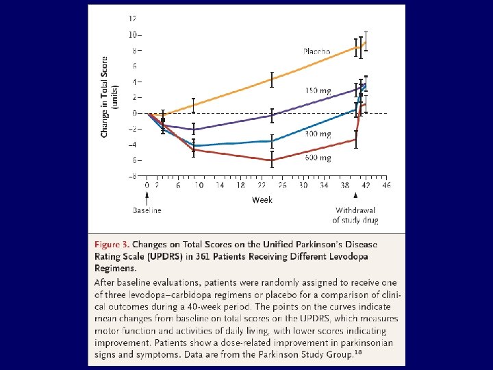 Efectos adversos: Tardíos Discinesia (40 -90% de los pacientes) desaparece si se disminuye la dosis pero esto restaura la rigidez y el resto de la sintomatología. • Conforme avanza la enfermedad aparece con dosis más bajas y con mayor intensidad (evidente tras 2 años en más del 75%, a los 5 solo un 34% mejor que al principio y 32% mueren, a los 10 años 100% con discinesia). Fluctuaciones en la respuesta (Efectos on-off), empeoramiento temporal y muy rápido de la rigidez e hipoquinesia – en algunos pacientes relacionado con cambios en los niveles plasmáticos de levodopa. – Aparece a partir del 2 año de tratamiento y a partir del 5º afecta a más del 50%