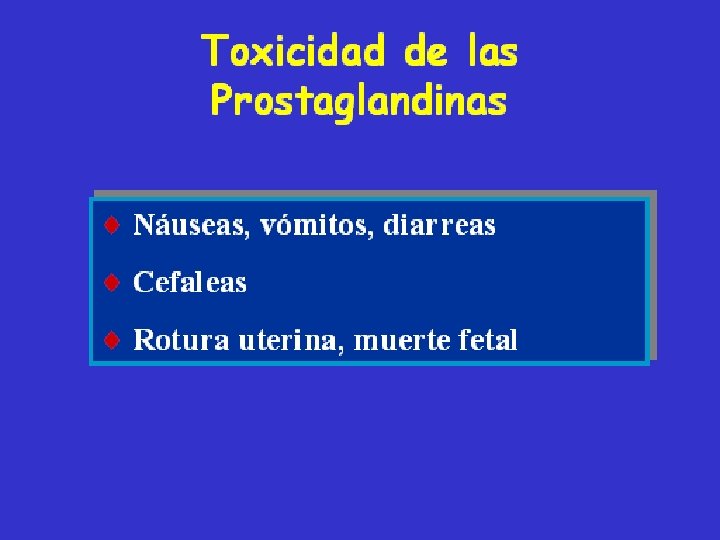 Prostaglandinas en Obstetricia • Aborto Retenido: Misoprostol 200 mcgrs cada 6 hrs. • Inducción de madurez Cervical: Misoprostol 50 mcrgs vaginal ( fondo de saco) • Hemorragia Post-parto: 400 mcgrs vía anal