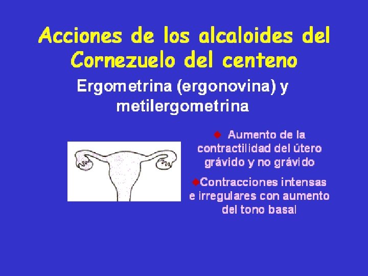 Drogas Estimulantes de la actividad uterina usadas en la practica clínica • OXITOCINA • PROSTAGLANDINAS • ALCALOIDES DERIVADOS DEL CORNEZUELO DE CENTENO