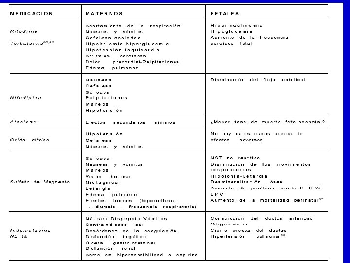 Nifedipino • Vía oral: inicia acción a los 20 min. y alcanza nivel máximo a las 2 hrs. . • Su acción con dosis única puede durar hasta 6 hrs. • Tratamiento: dosis de 10 a 30 mgrs al inicio 10 a 20 mgrs cada 6 hrs. Su uso ha demostrado prolongación del embarazo con disminución del SDRI y sus efectos adversos. Recomendación A MINSAL