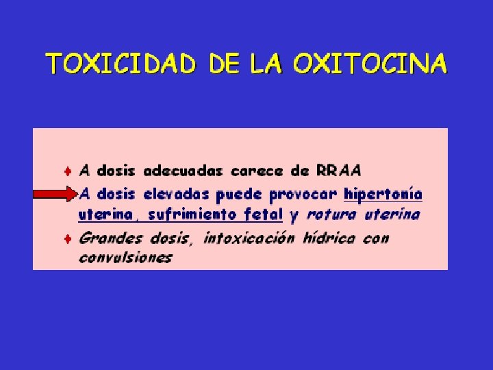 Propiedades ocitocina • · Musculatura uterina: facilita la transmisión nerviosa. · Glándula mamaria: contribuye en la galactopoyesis. · Efecto vasoconstrictor: disminuye el flujo sanguíneo. · Disminuye la filtración glomerular, excresión renal de agua y electrolitos. · En la fecundación inhibe la ovulación. · Receptores de oxitocina: se expresan principalmente en la decidua, miometro y tejido mamario. · Excreción: hígado y riñón. · Metabolizada por la oxitocinasa. · No tiene validez demostrada para inducir maduración cervical. · Debe usarse con cérvix favorable: Score de Bishop de 6 ó más.