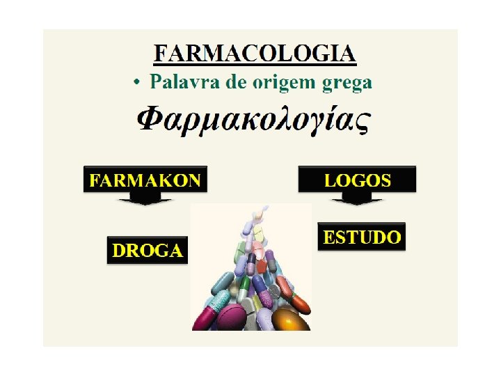 Farmacologia • É a ciência que estuda as interações entre os compostos químicos com o organismo vivo ou sistema biológico, resultando em um efeito maléfico (tóxico) ou benéfico ( medicamento ).
