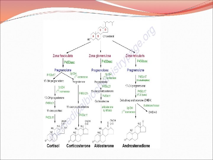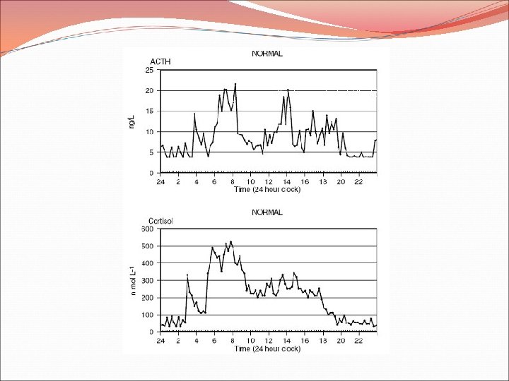 REGULACION DE LA SECRECION DE GLUCOCORTICOIDES • La ACTH regula y mantiene la secreción de cortisol, activando la adenilciclasa en las zonas fascicular y reticular, a través de la unión a un receptor de membrana especifico para la ACTH. • El AMPc estimula la esteroidogénesis activando una enzima que cataliza la transformación del colesterol en pregnenolona (paso limitante). • El ritmo circadiano hipotalámico que marca la secreción de CRH se trasmite a las suprarrenales. La secreción de cortisol es máxima alrededor de las 8 a. m. y mínima en las ultimas horas de la tarde. • La secreción diaria de cortisol en un adulto es de 14 a 20 mg.
