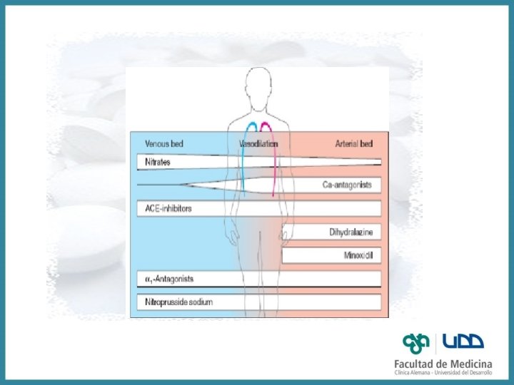 Farmacocinética Labetalol • Efecto de primer paso importante (GI y hepático) F 25% • Metabolismo hepático (glucuronización) • T ½ 6 a 8 h. 50% UPP • Ajuste de dosis en falla hepática severa • Uso oral e IV Carvedilol • Efecto de primer paso hepático importante ( 25 a 35%) • Metabolismo CYP 2 D 6 con metabolitos activos T ½ 7 a 11 h. 98% UPP • 16% eliminación renal • Ajuste de dosis en falla hepática e ICC