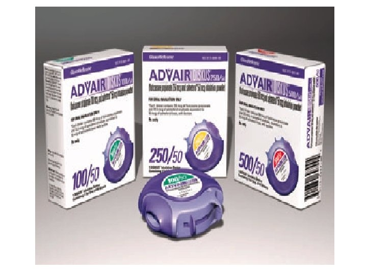Fluticasone/Salmeterol DPI (Advair) • Proven as effective as combination therapy with separate flovent and serevent inhalers • Improves compliance – Only one inhalation twice a day required • Diskus dry powder inhaler – Must instruct on delivery technique – Shows number of remaining doses