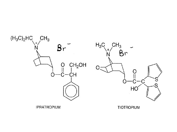 Anticolinergici correntemente utilizzati • Queste molecole sono usate per uso topico inalatorio • Escrete immodificate nelle feci • Gli effetti collaterali sistemici sono scarsi; si può avere secchezza delle fauci. • Meno efficaci dei 2 -agonisti a cui possono essere associati; attivi su sottogruppi di pazienti asmatici, efficacia ridotta nel trattamento cronico. • Usati anche nel trattamento dell’attacco acuto d’asma