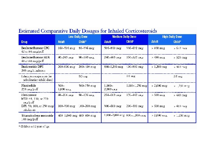 Mechanism of Action • Inhibit production of inflammatory cytokines • Decrease number of eosinophils & mast cells • Decrease mucous secretion • Increase synthesis of ß-2 receptors Important with concomitant beta-agonist use