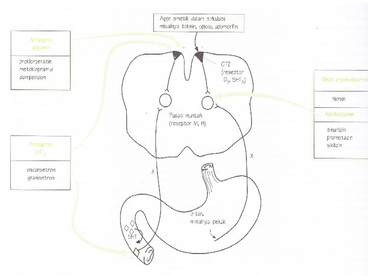 STIMULAN MOTILITAS Yg dipengaruhi : Res dopamin, 5 HT (5 Hidroksi. Triptamin) 1. METOCHLOPRAMID * Antagonis dopamin blok res dopamin sentral pd CTZ efek antiemetik * Hambat pelepasan ACh akibat aktivasi 5 HT 4 * IO : Hindari pemberian bersama digoksin 2. DOMPERIDON * Antagonis dopamin * mengurangi refluks empedu dr duodenum ke lambung