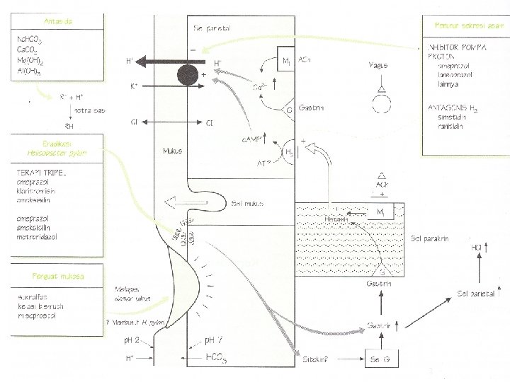 Acid Production • 2, 5 l / hari • p. H < 1 • Diproduksi pleh sel parietal lambung Mucus production: • Produced by mucus-secreting cells • Also produce bicarbonate, which becomes trapped in the mucus layer => p. H gradient across the mucus layer (can becom destroyed by alcohol)