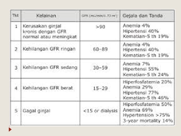 Definisi � Terjadinya kerusakan ginjal selama tiga bulan, yang ditandai dengan kerusakan struktur dan fungsional dari ginjal dengan atau tanpa penurunan GFR � Nilai GFR < 60 ml/min dengan disertai atau tanpa kerusakan ginjal