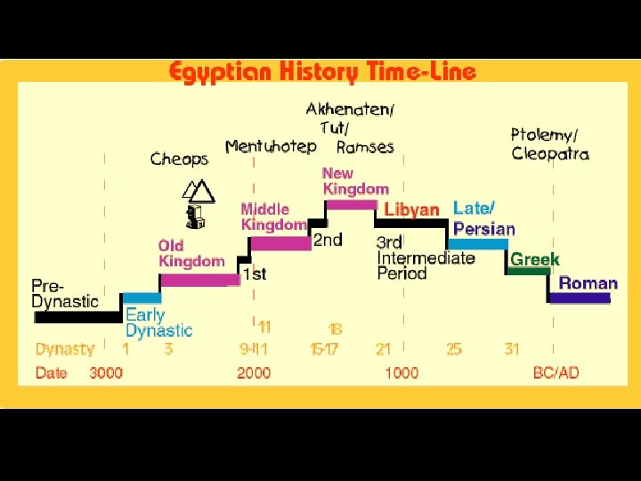 Historian have divided Egyptian history into three major periods: the Old Kingdom, the Middle Kingdom and the New Kingdom. These were long periods of stability characterized by strong monarchical authority, competent bureaucracy, freedom from invasion, much construction of pyramids and temples, and considerable intellectual and cultural development and activity. These major periods were punctuated by ages of political chaos known as the Intermediate Periods, which were characterized by weak political structures and rivalry for leadership, invasions, a decline in building activity, and a restructuring of society. Early Dynastic Period c. a. 3100 -2700 B. C. The Old Kingdom c. a. 2700 -2200 B. C. First Intermediate Period c. a. 2200 -2050 B. C. The Middle Kingdom c. a. 2050 -1652 B. C. Second Intermediate Period c. a. 1652 -1567 B. C. The New Kingdom c. a. 1567 -1085 B. C. Post-empire c. a. 1985 -30 B. C.
