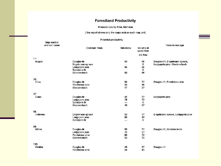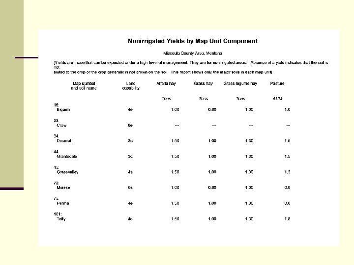 Western Montana Local Criteria n Not already designated as Prime, Prime if Irrigated or Statewide, and have one or more of the following: n n Soil map units that have 50% or more named components meeting prime or statewide. Soil map units that have slope < 15%, are not frequently flooded, are poorly drained or better, and where at least 50% of the named components meet at least one of the following minimum yields:
