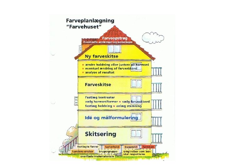 Farveplanlægning. Før man begynder sin farveplanlægning er der mange ting der skal tages hensyn til. 1. Fastlagte farver, som f. eks. Tæpper, møbler, billeder, omgivelser. 2. Hvem er kunden, alder, livsstil, smag, osv. 3. Ønsker kunden en bestemt stemning i rummet. 4. Hvad skal rummet bruges til, ophold, gennemgang, hvile, osv. 5. Overflade på de emner der skal malebehandles. 6. Lysforhold. 7. Byggestil. ( Stil form og farve ) 8. Æstetiske overvejelser. Hvad gør man/ gør man ikke. Dette kan være meget traditionsbundet.