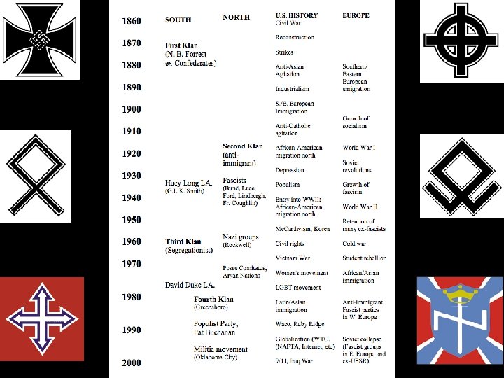 Searchlight (UK) on European fascism http: //www. searchlightmagazine. com Center for New Community http: //www. buildingdemocracy. org Turn it Down: Campaign Against White Power Music http: //turnitdown. newcomm. org Novel warns of American homegrown fascism, 1935 Political Research Associates http: //www. publiceye. org Hatewatch http: //www. splcenter. org/intel/hatewatch Militia followers bomb Oklahoma City, 1995 Hate symbols http: //www. adl. org/hate_symbols/default. asp Jobbik gains 17% of vote, 46 seats in Hungarian Parliament, 2010 Extreme-right recruiting in Tea Party (NAACP report, 2010)
