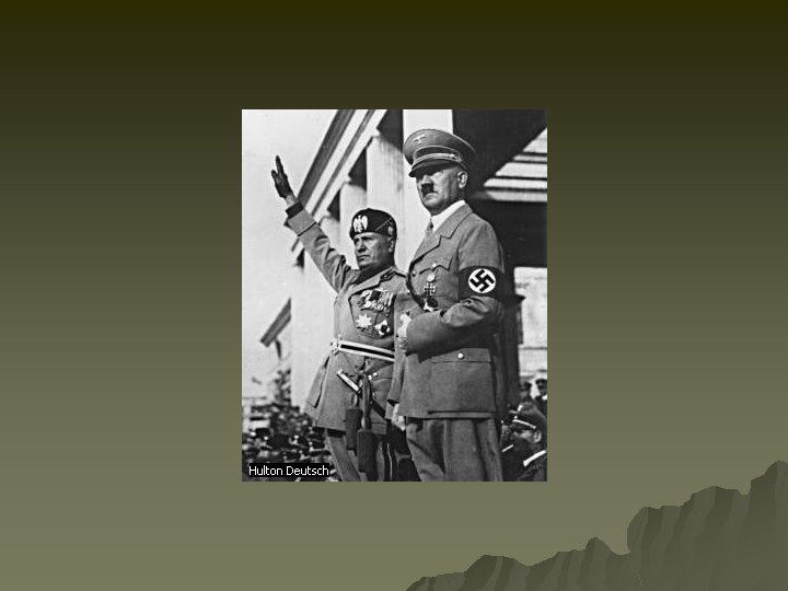 Mussolini & Totalitarianism Musso built the 1 st totalitarian state which was never as extreme as Germany’s or Soviet Unions. u What was its appeal? u – Promised strong, stable gov & to end political feuding which had paralyzed democracy. – Nationalism appealed to many – revived nat’l pride – Promised to restore the former glory of the Roman Empire by turning the Mediterranean into a Roman lake. – Projected sense of power during times of despair & disorder