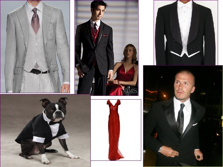 Occasional clothes – formal situations • Women: formal, smart clothes, long dresses for balls, shorter or to knees skirts and dresses for parties, blouses, accessories, costumes; jewellery (necklace, bracelet, earrings, rings). Handbags should match their dresses and shoes. Fashion also concers accessories, hairstyle and make-up. • Men: dark suit or tuxedo, a white shirt with a tie or a bow tie and dark shoes. Special occasions or some jobs require wearing uniforms, white coats, costumes, aprons. (in banks, policemen)