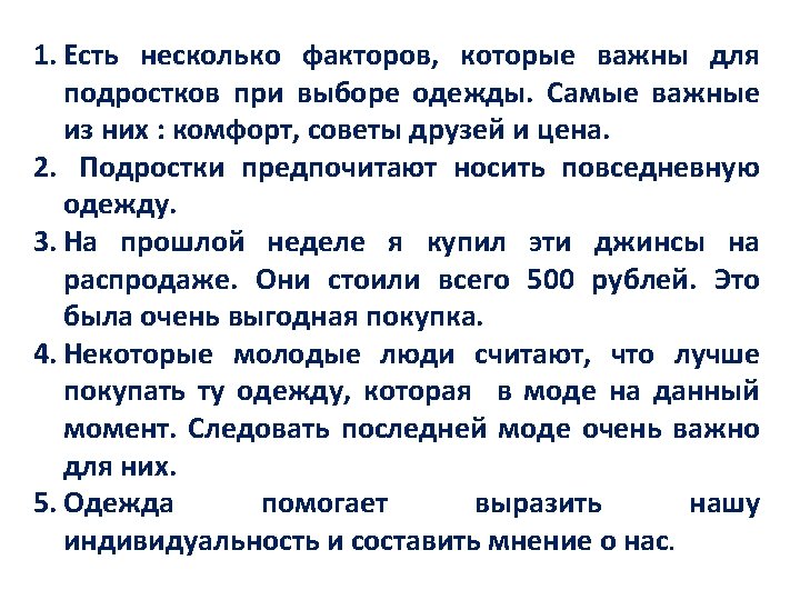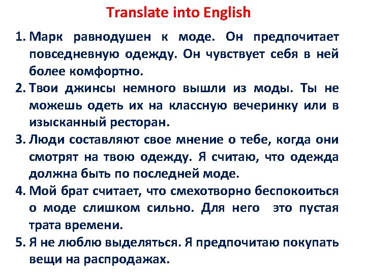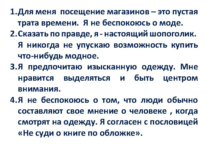 Hello! I’m Helen. I am from England. I like to wear fashionable clothes. All my classmates say that I’m trendy. Yes, I am! I enjoy wearing trendy clothes. I like to look cool and attractive. It’s very important to know what is in fashion at the present moment. I like shopping and spend hours picking clothes that suit me. My classmates say that I am interested in fashion too much, but it’s not that bad, is it? Sometimes I can appear in something really gorgeous. When you are up with the latest fashions you feel you are an individual. If I could I would wear different pieces of clothing every day. I wish I had lots of money to do that.