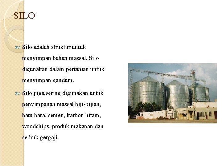 SILO Silo adalah struktur untuk menyimpan bahan massal. Silo digunakan dalam pertanian untuk menyimpan gandum. Silo juga sering digunakan untuk penyimpanan massal biji-bijian, batu bara, semen, karbon hitam, woodchips, produk makanan dan serbuk gergaji.