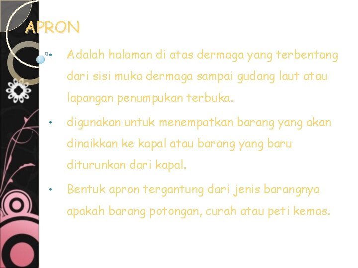 APRON • Adalah halaman di atas dermaga yang terbentang dari sisi muka dermaga sampai gudang laut atau lapangan penumpukan terbuka. • digunakan untuk menempatkan barang yang akan dinaikkan ke kapal atau barang yang baru diturunkan dari kapal. • Bentuk apron tergantung dari jenis barangnya apakah barang potongan, curah atau peti kemas.