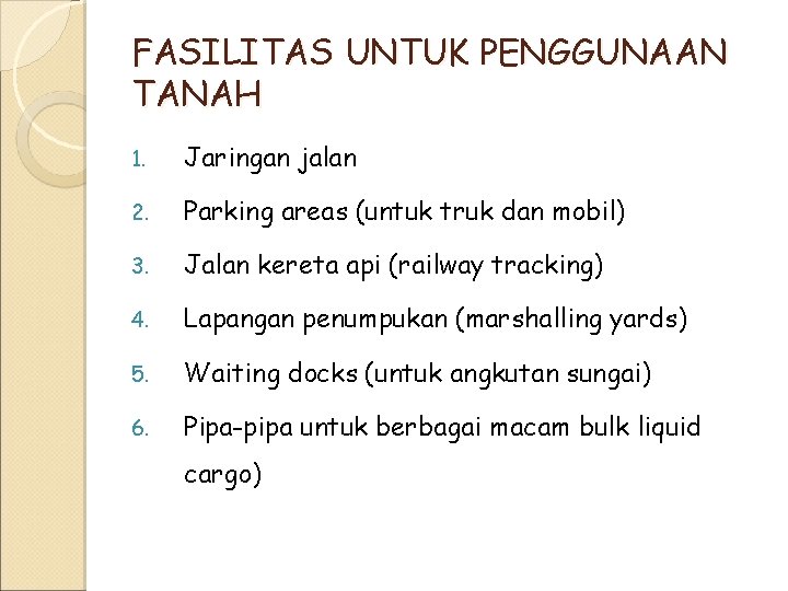 FASILITAS UNTUK PENGGUNAAN TANAH 1. Jaringan jalan 2. Parking areas (untuk truk dan mobil) 3. Jalan kereta api (railway tracking) 4. Lapangan penumpukan (marshalling yards) 5. Waiting docks (untuk angkutan sungai) 6. Pipa-pipa untuk berbagai macam bulk liquid cargo)
