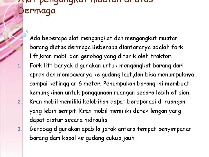 Alat pengangkut muatan di atas Dermaga Ada beberapa alat mengangkat dan mengangkut muatan barang diatas dermaga. Beberapa diantaranya adalah fork lift, kran mobil, dan gerobag yang ditarik oleh traktor. 1. Fork lift banyak digunakan untuk mengangkat barang dari apron dan membawanya ke gudang laut, dan bisa menumpuknya sampai ketinggian 6 meter. Penumpukan barang ini membuat kemungkinan untuk penggunaan ruangan secara lebih efisien. 2. Kran mobil memiliki kelebihan dapat beroperasi di ruangan yang lebih sempit. Kran mobil memiliki derek lengan yang dapat diatur secara hidraulis. 3. Gerobag digunakan apabila jarak antara tempat penyimpanan barang dari kapal ke gudang cukup jauh.