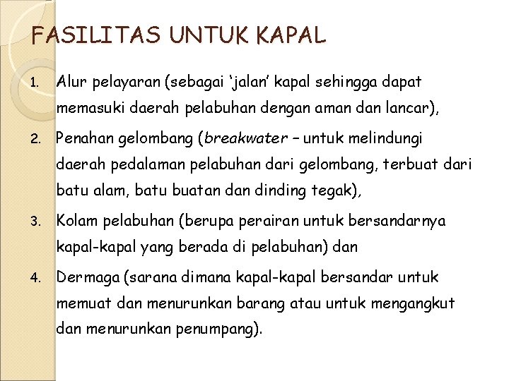 FASILITAS UNTUK KAPAL 1. Alur pelayaran (sebagai ‘jalan’ kapal sehingga dapat memasuki daerah pelabuhan dengan aman dan lancar), 2. Penahan gelombang (breakwater – untuk melindungi daerah pedalaman pelabuhan dari gelombang, terbuat dari batu alam, batu buatan dinding tegak), 3. Kolam pelabuhan (berupa perairan untuk bersandarnya kapal-kapal yang berada di pelabuhan) dan 4. Dermaga (sarana dimana kapal-kapal bersandar untuk memuat dan menurunkan barang atau untuk mengangkut dan menurunkan penumpang).