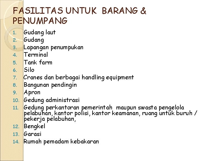 FASILITAS UNTUK BARANG & PENUMPANG 1. 2. 3. 4. 5. 6. 7. 8. 9. 10. 11. 12. 13. 14. Gudang laut Gudang Lapangan penumpukan Terminal Tank farm Silo Cranes dan berbagai handling equipment Bangunan pendingin Apron Gedung administrasi Gedung perkantoran pemerintah maupun swasta pengelola pelabuhan, kantor polisi, kantor keamanan, ruang untuk buruh / pekerja pelabuhan, Bengkel Garasi Rumah pemadam kebakaran