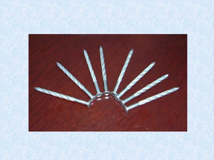 Spiral Groove Nails • Used to fasten metal on roofs because the nails are less likely to work loose and cause leaks
