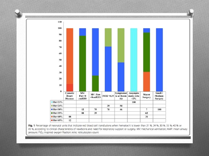 INDICAÇÕES DE TRANSFUSÃO O O Não se basear apenas na Hb; raciocinar com todas as variáveis envolvidas. Em condições estáveis, não transfundir. Clínica: Os achados clínicos refletem as conseqüências da liberação inadequada de O 2 aos tecidos, com sinais e sintomas inespecíficos que refletem modificações na função cardiorrespiratória, perfusão e taxa metabólica (pressão venosa central de O 2< 25 mm. Hg). Como este cálculo é complexo, adotamos o cálculo do oxigênio disponível < 7 ml de O 2/100 ml de sangue nos RN com menos de 32 semanas de gestação: na maioria das vezes está associado a sinais e sintomas de anemia. O 2 disponível = (0, 54 + 0, 005 x semanas a partir da concepção) x Hb. (RN com I. Gest. < 32 sem. , não transfundidos) taquicardia persistente - FC > 160 bpm taquipnéia persistente - FR > 60/min (sem pneumopatia) sonolência - na ausência de afecções do SNC ou distúrbio metabólicos fadiga fácil após mamadas aumento insatisfatório do peso (25 g/dia) recusa alimentar não há evidência para indicar a transfusão no recém-nascido pré-termo com apnéia