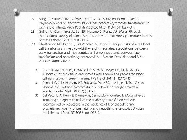 DISCUSSÃO O Ter critérios de restrição é importante. O Estudo multicêntrico, com 1018 neonatologistas mostrou que 51, 1% das Unidades têm diretrizes para indicação de transfusão (28); O Guillen, et al. Semin. Perinatol. 2012 O Procedimento não é isento de riscos: O Estudos mostram maior relação de transfusão sanguínea com ECN (5, 29 -31), hemorragia intraventricular (3, 29) e morte (4).