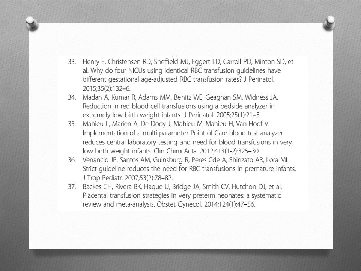 Limiar de Transfusão para RN Pré-Termo: Até onde devemos ir ? Autor(es): Edward F. Bell. Apresentação: Mariana Regis Jansen, Mathias Palácio John, Paulo R. Margotto O Este Editorial compara ambos estudos anteriores e conclui: O Devido aos menores riscos na transfusão na medicina atual (métodos mais eficazes dos bancos de sangue), deve-se “frear” o movimento contra a transfusão (grupo restritivo); O Esforços para restrição da transfusão se baseiam nos riscos das mesmas, incluindo infecção de doador para receptor. Cuidados na seleção dos doadores e leucorredução ou radiação do sangue devem reduzir esse risco para um nível muito baixo; O Adoção de Programas de Doador-único devem ser a norma para RNMBP e, provavelmente para todos os pacientes em UTIs neonatal; limitando a exposição a apenas 1 doador; O Decisões sobre transfusão devem se basear em guidelines e no estado clínico do paciente. O risco da transfusão per si é muito baixo e deve ter um peso menor na decisão. Esforços para eliminar a transfusão (tolerância a anemia) devem ser revistos, em virtude dos mínimos benefícios da não-transfusão, evidenciados nesses dois Estudos, e do potencial maior benefício da transfusão liberal no Estudo Iowa; O As vantagens de se transfundir menos é menor do que o potencial benefício da transfusão liberal na proteção cerebral. O A questão permanece: Até onde devemos suportar a anemia no RNPT? O