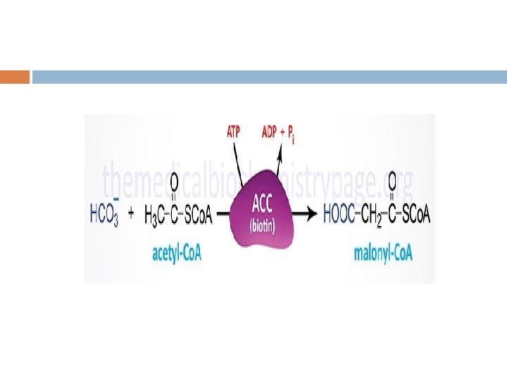 The synthesis of malonyl-Co. A is the first committed step of fatty acid synthesis and the enzyme that catalyzes this reaction, acetyl. Co. A carboxylase (ACC), is the major site of regulation of fatty acid synthesis. Like other enzymes that transfer CO 2 to substrates, ACC requires a biotin co-factor. Acetyl-Co. A carboxylase is called an ABC enzyme due to the requirements for ATP, Biotin, and CO 2 for the reaction.