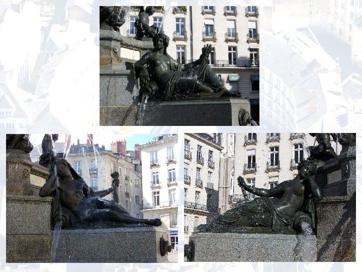 D'autres statues symbolisent les huit génies de l'industrie et du commerce : soufflant de l'eau au travers de coquillages et juchés sur des dauphins crachant de l'eau par les narines, ils rappellent le rôle majeur du port dans l'économie de la cité. Les statues sont l'œuvre des sculpteurs Daniel Ducommun du Locle (pour la ville et les cours d'eau) et Guillaume Grootaërs (pour les génies), ainsi que du fondeur nantais Jean-Simon Voruz le créateur de l'escalier du passage Pommeraye