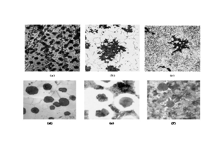Uygulama (a) White cast iron prior to heat treatment. (b) Ferritic malleable iron with graphite nodules and small Mn. S inclusions. (c) Pearlitic malleable iron drawn to produce a tempered martensite matrix. (d) Annealed ferritic ductile (nodular) iron. (e) As-cast ferritic-pearlitic ductile iron. (f) Normalized pearlitic ductile iron.